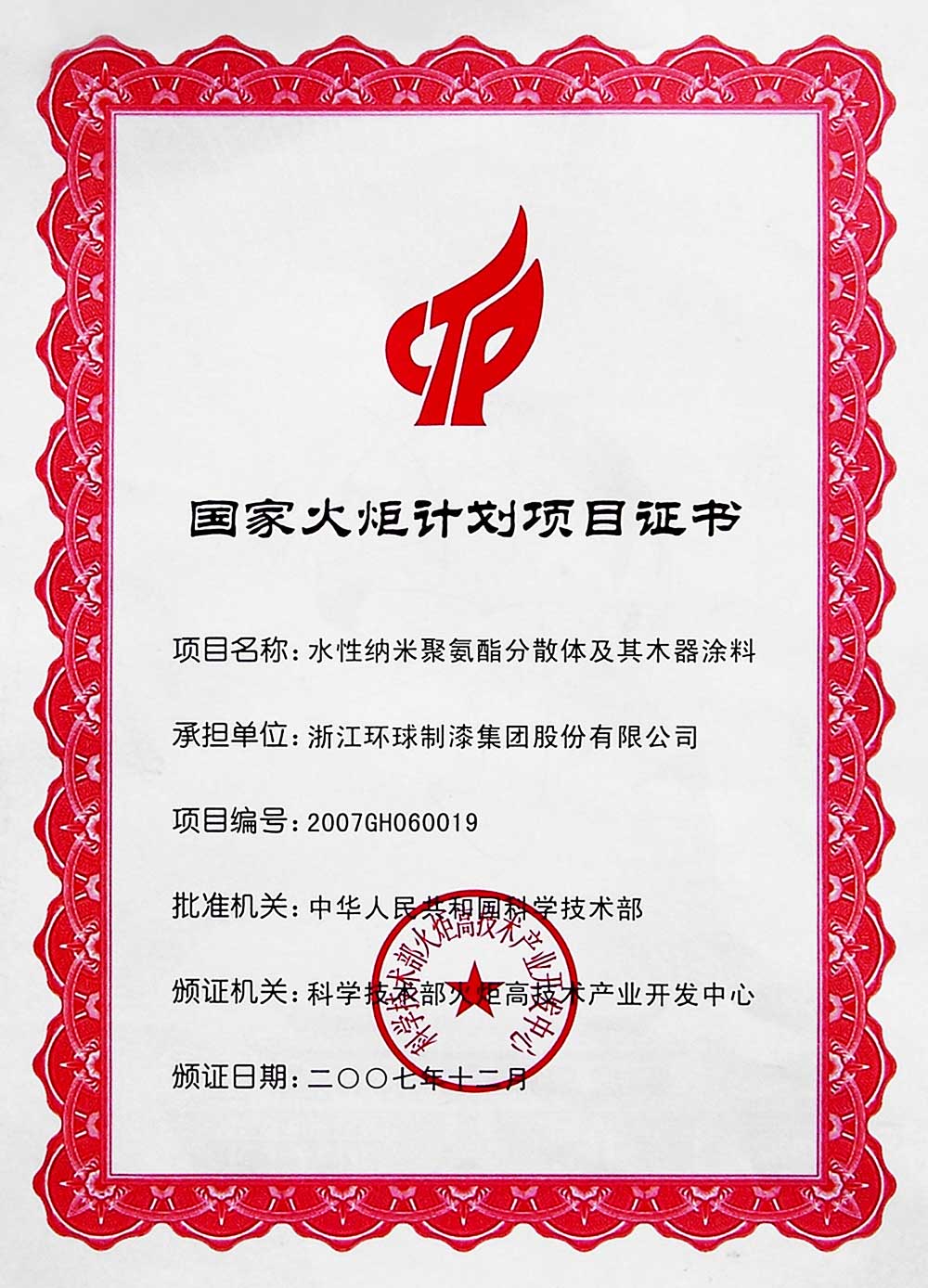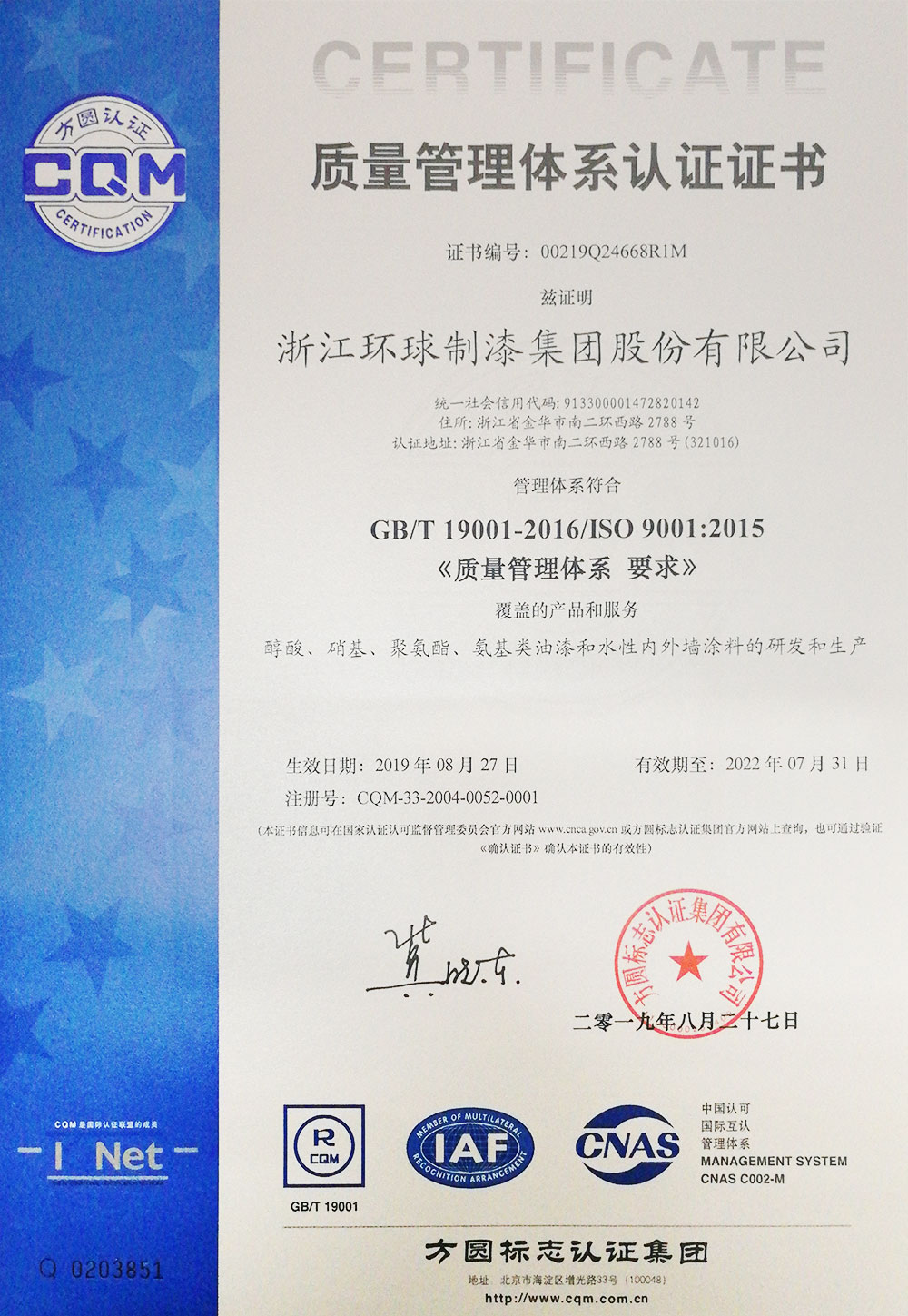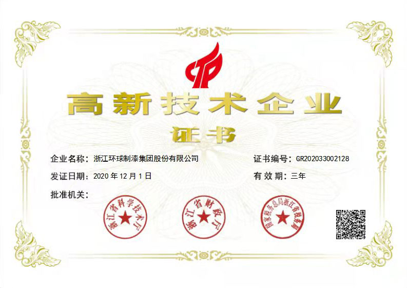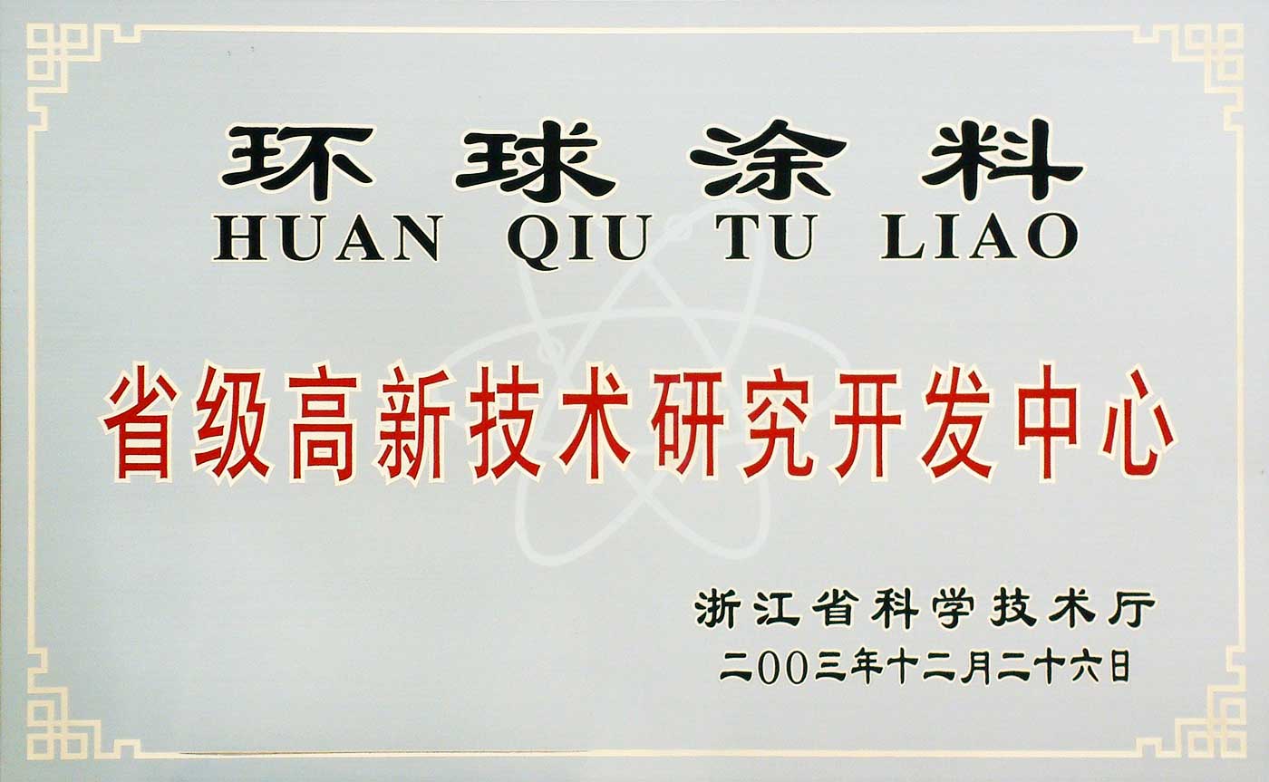 公司一貫堅持以質(zhì)量求生存,以科技求發(fā)展,恪守“創(chuàng)精品、創(chuàng)優(yōu)質(zhì)、創(chuàng)名牌,為市場、為用戶、為明天”的質(zhì)量方針,精益求精,不斷超越,公司始終重視科技研發(fā),堅持技術(shù)創(chuàng)新,擁有較強的科研開發(fā)能力,主導產(chǎn)品核心技術(shù)均為企業(yè)自主研發(fā)獲得,擁有專利17項。公司通過ISO9001質(zhì)量管理體系和ISO14001環(huán)境體系認證,公司還榮獲“國家高新技術(shù)企業(yè)”、“中國工業(yè)漆企業(yè)10強”、“納稅信用等級AAA級企業(yè)”等稱號,其產(chǎn)品榮獲“中國名優(yōu)建材產(chǎn)品及建設工程推薦產(chǎn)品”、國家裝飾、裝修產(chǎn)品“3C”認證,“浙江名牌產(chǎn)品”、“浙江省著名商標”等榮譽。